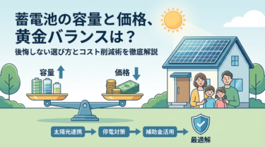 家庭用蓄電池の導入を検討する際、最も悩ましいのが「容量」と「価格」のバランスではないでしょうか。結論からお伝えすると、蓄電池は容量が大きいほど本体価格は高くなりますが、1kWhあたりの容量単価で見ると割安になる傾向があります。本記事では、5kWhから10kWh以上まで容量別の具体的な価格相場や、4人家族の電気使用量に基づいた最適な容量の目安を徹底解説します。太陽光発電との連携や停電対策、さらには国 … 続きを読む 【保存版】蓄電池の容量が大きいほど価格が安くなる?