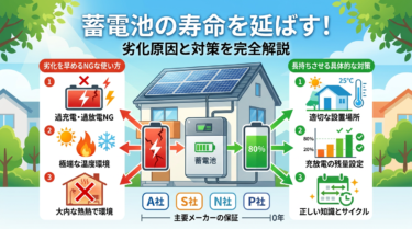 蓄電池を導入したものの、「寿命が縮むのではないか」「劣化を早める原因は何だろう」と不安に感じていませんか?蓄電池の寿命が縮む主な原因は、過充電や過放電、そして極端な温度環境などの使用環境にあります。つまり、適切な設置場所の選定や充放電の残量設定を行うことで、劣化を防ぎ長持ちさせることが可能です。この記事では、リチウムイオン電池の基本的なサイクル寿命から、劣化を早めるNGな使い方、寿命を延ばす具体的 … 続きを読む 蓄電池の寿命が縮む?蓄電池の劣化を早める原因と長持ちさせる対策